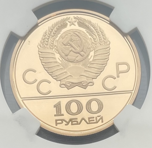 Золотая монета 100 рублей "Олимпийский огонь" 1980г. ММД В слабе NGC PROOF 69 ULTRA CAMEO