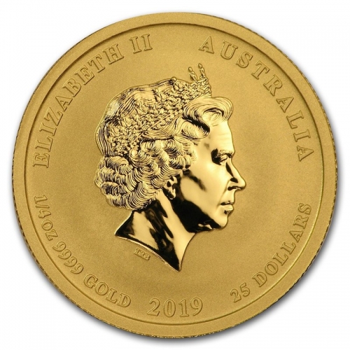 • На аверсе изображен профиль королевы Елизаветы II. Сверху надписи: «ELIZABETH II» (Елизавета II) и «AUSTRALIA» (Австралия). Также внизу указаны вес (0,25 oz – 0,25 унция), проба (9999), название металла (Au - золото), год (2019) и номинал монеты – «100 DOLLARS» - 25 австралийских долларов.