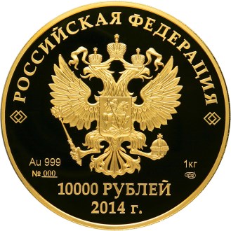 на зеркальном поле диска – рельефное изображение Государственного герба Российской Федерации, над ним вдоль канта – надпись полукругом: "РОССИЙСКАЯ ФЕДЕРАЦИЯ", внизу под гербом в две строки: слева – обозначения металла по Периодической системе элементов Д.И. Менделеева, пробы сплава и порядковый номер монеты № s___, справа – обозначение содержания химически чистого металла и товарный знак монетного двора, внизу в центре в две строки – номинал монеты: "10000 РУБЛЕЙ" и дата: "2014 г.".