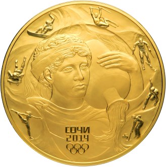 на матовом поле диска – рельефное аллегорическое изображение Мацесты в образе молодой женщины в античных одеяниях с кувшином на плече, из которого она выливает воду, вокруг нее вдоль канта – фигурки спортсменов, представляющих зимние виды спорта: фигурное катание, скелетон, сноуборд, фристайл, лыжные гонки, шорт-трек и кёрлинг, внизу в две строки – надпись: "СОЧИ" и дата: "2014", под ними – пять олимпийских колец.